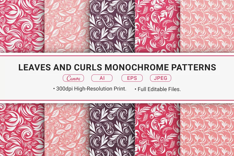 Elevate your designs with the 5 Leaves and Curls Monochrome Seamless Pattern collection.