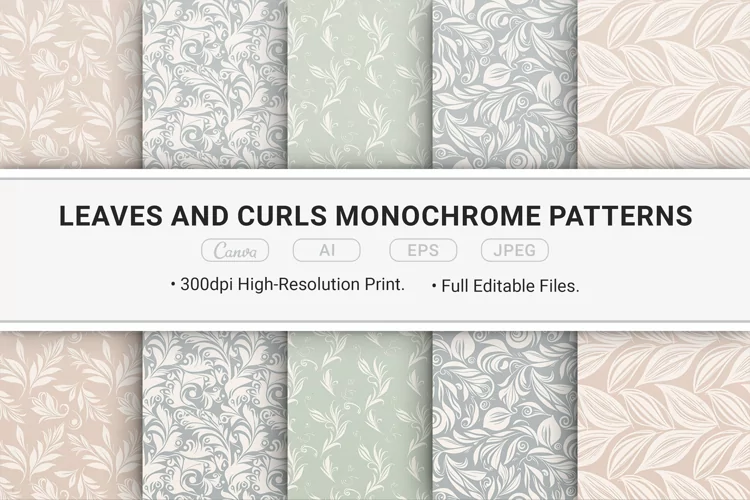 Elevate your designs with 5 stunning seamless patterns featuring leaves and curls in a chic monochrome palette.