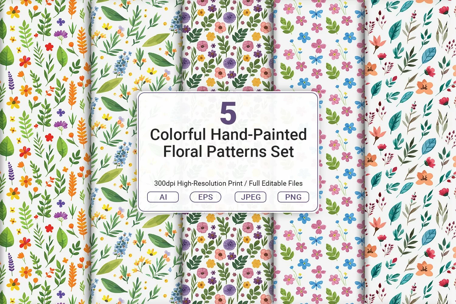Elevate your projects with this vibrant collection of five hand-painted floral patterns.