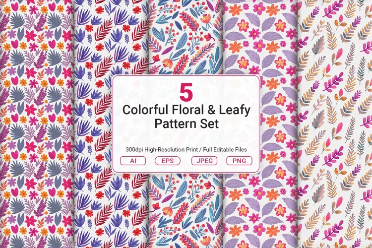 Brighten up your projects with this vibrant set of 5 floral and leafy patterns!
