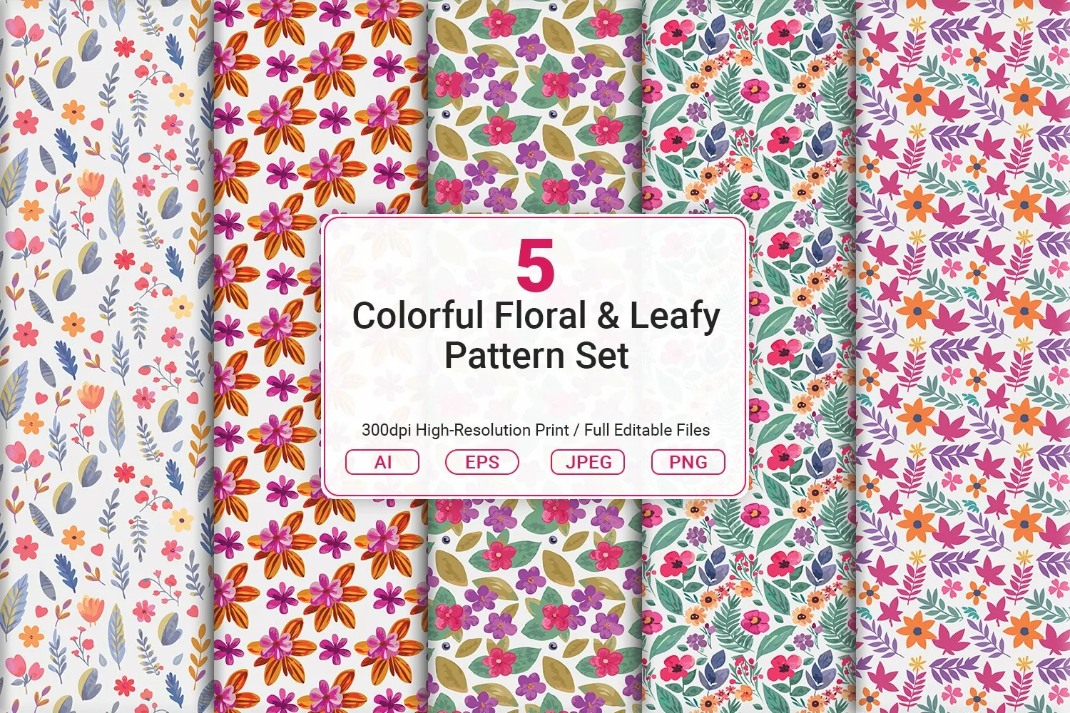 Brighten up your projects with this vibrant set of 5 floral and leafy patterns!