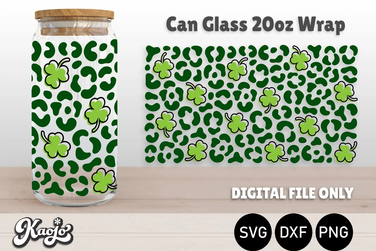 St Patrick's Day Leopard Shamrock Can Glass 20oz Wrap SVG example image 1