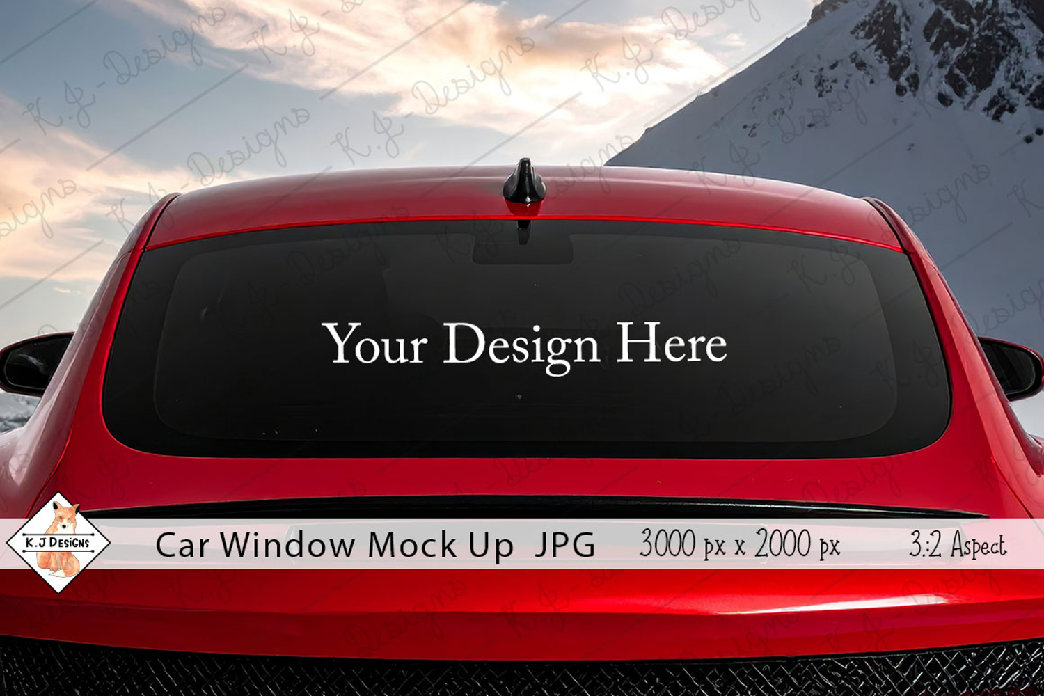 Display your designs on the back of this red sports car window mock up jpg photo.