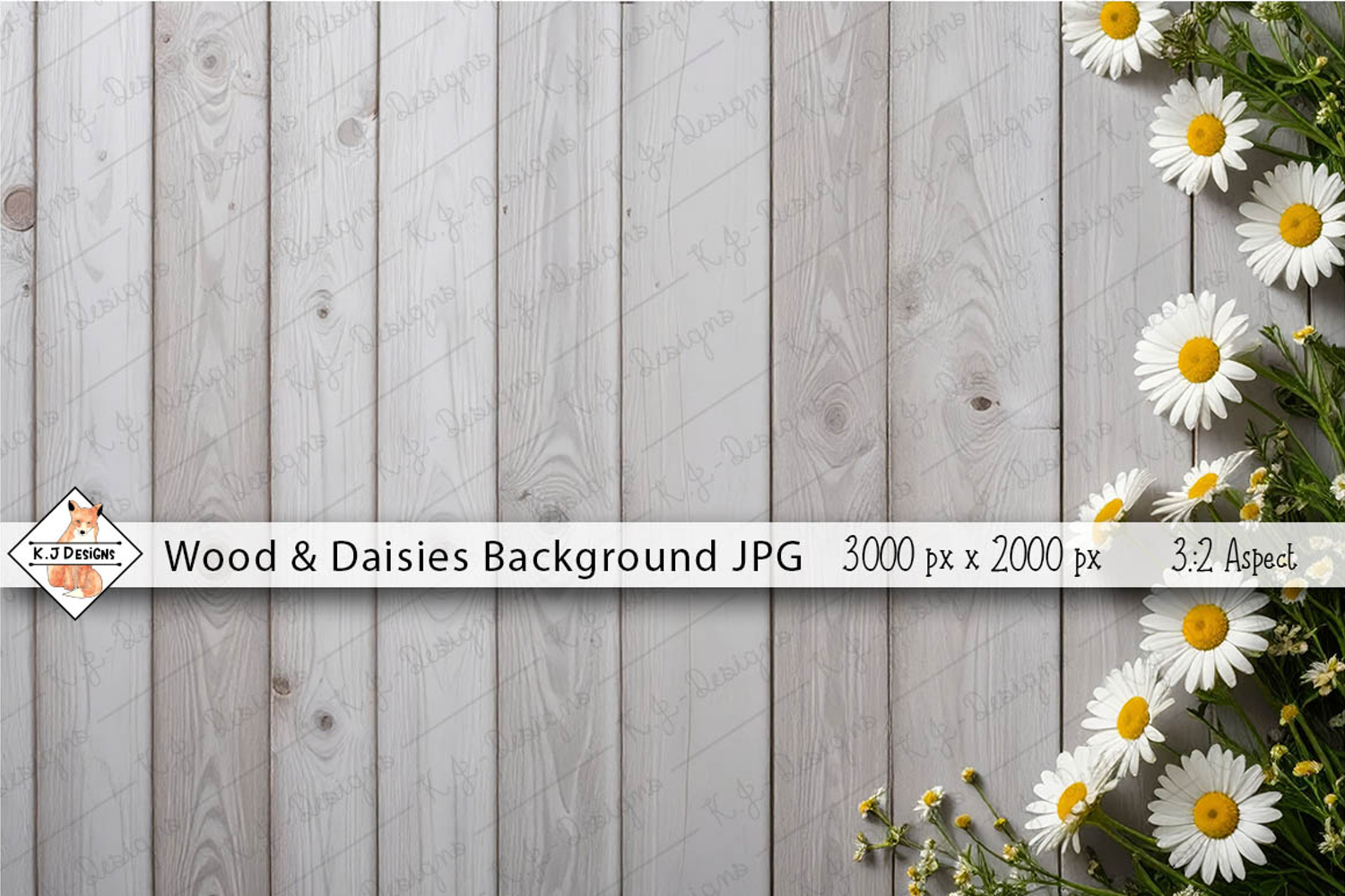 Gray wood planks and daisies on the edge for adding your designs to.