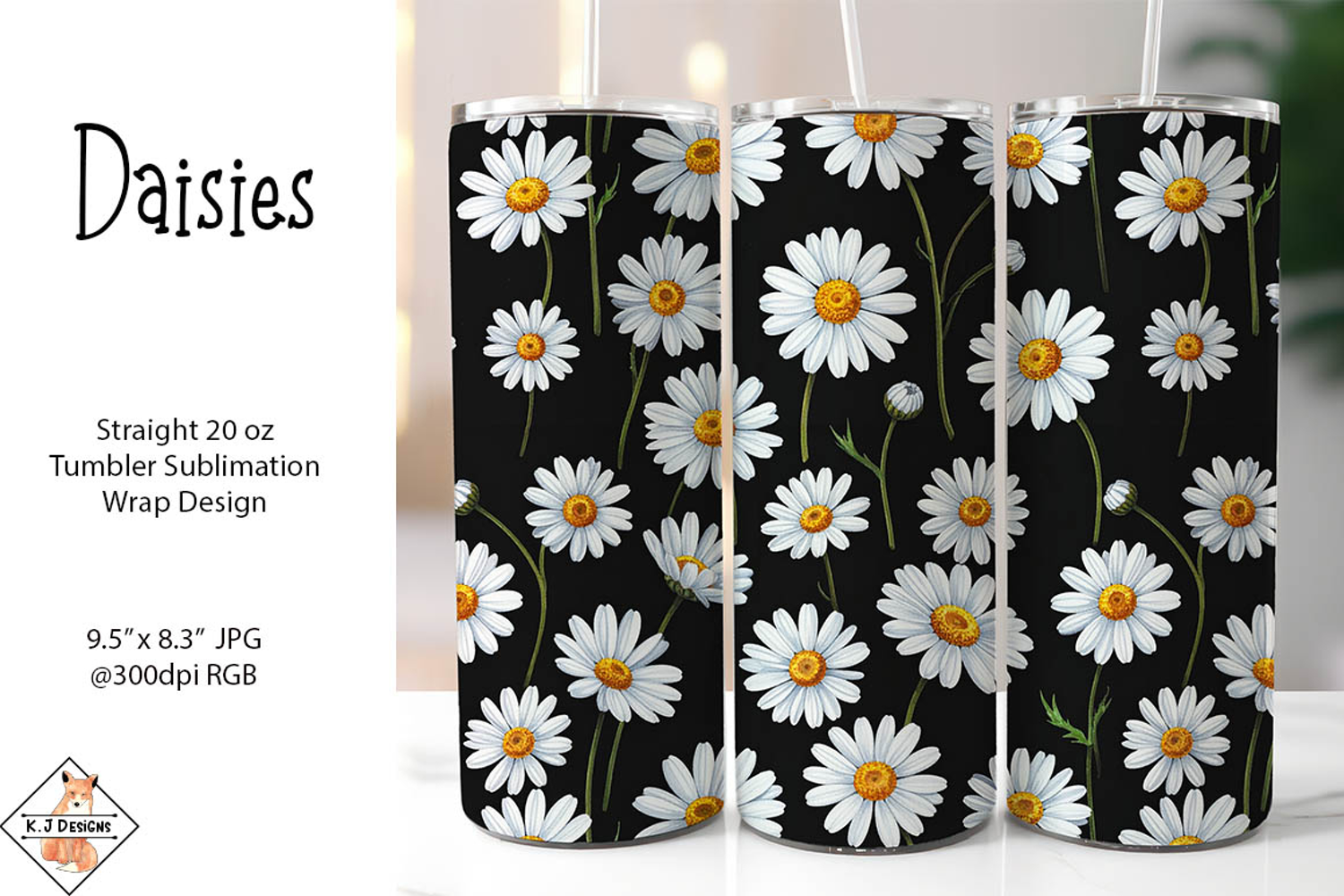 Daisies on a black background design for 20 oz straight tumbler wrap sublimation.