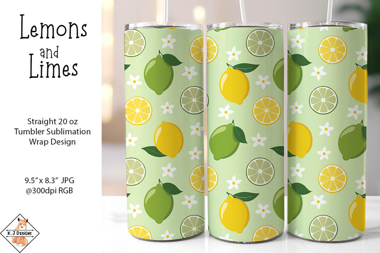 Summer design of lemons and limes for 20 oz straight tumbler wrap sublimation.