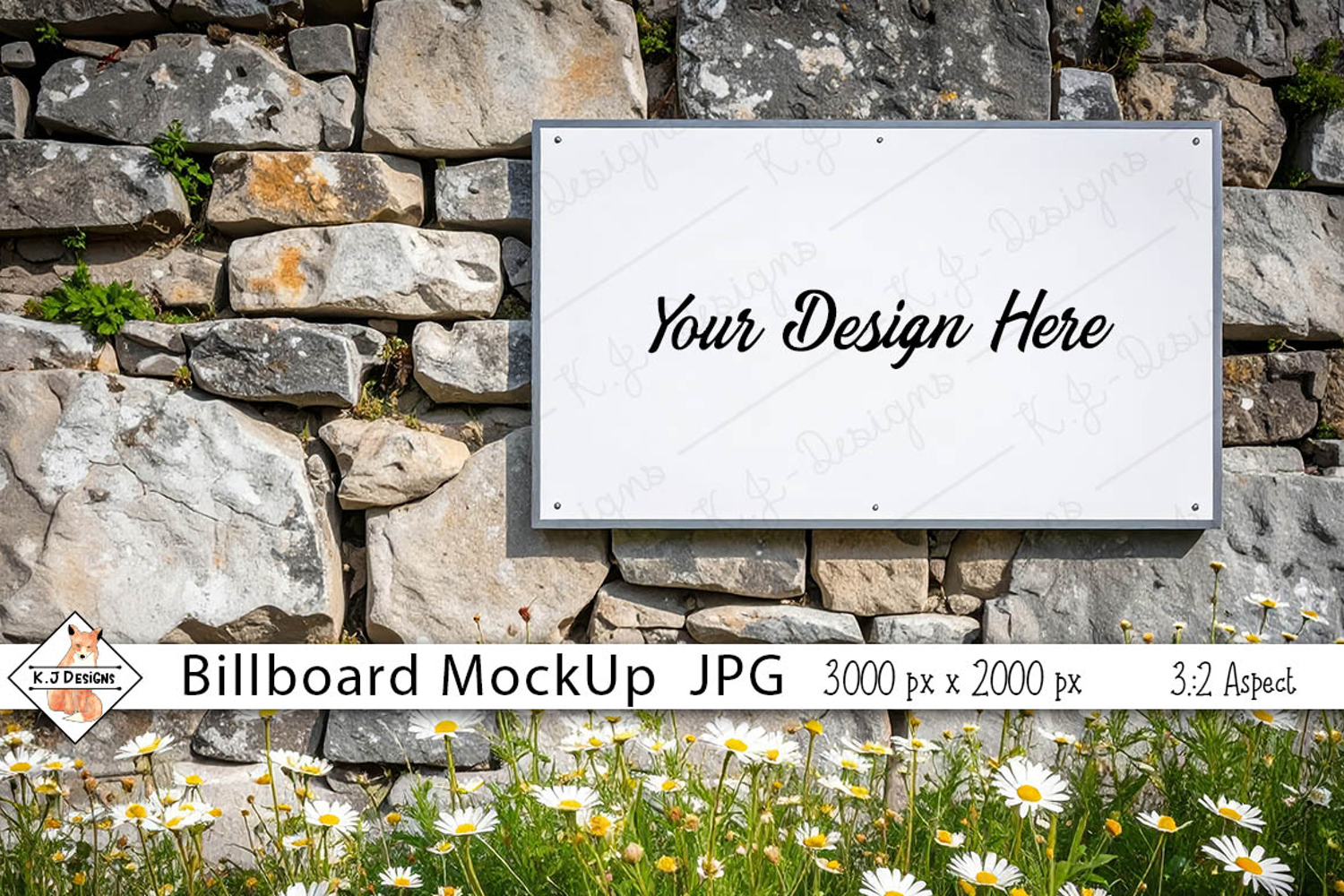 Display your design on this white billboard jpg photo mockup, with a stone wall background.