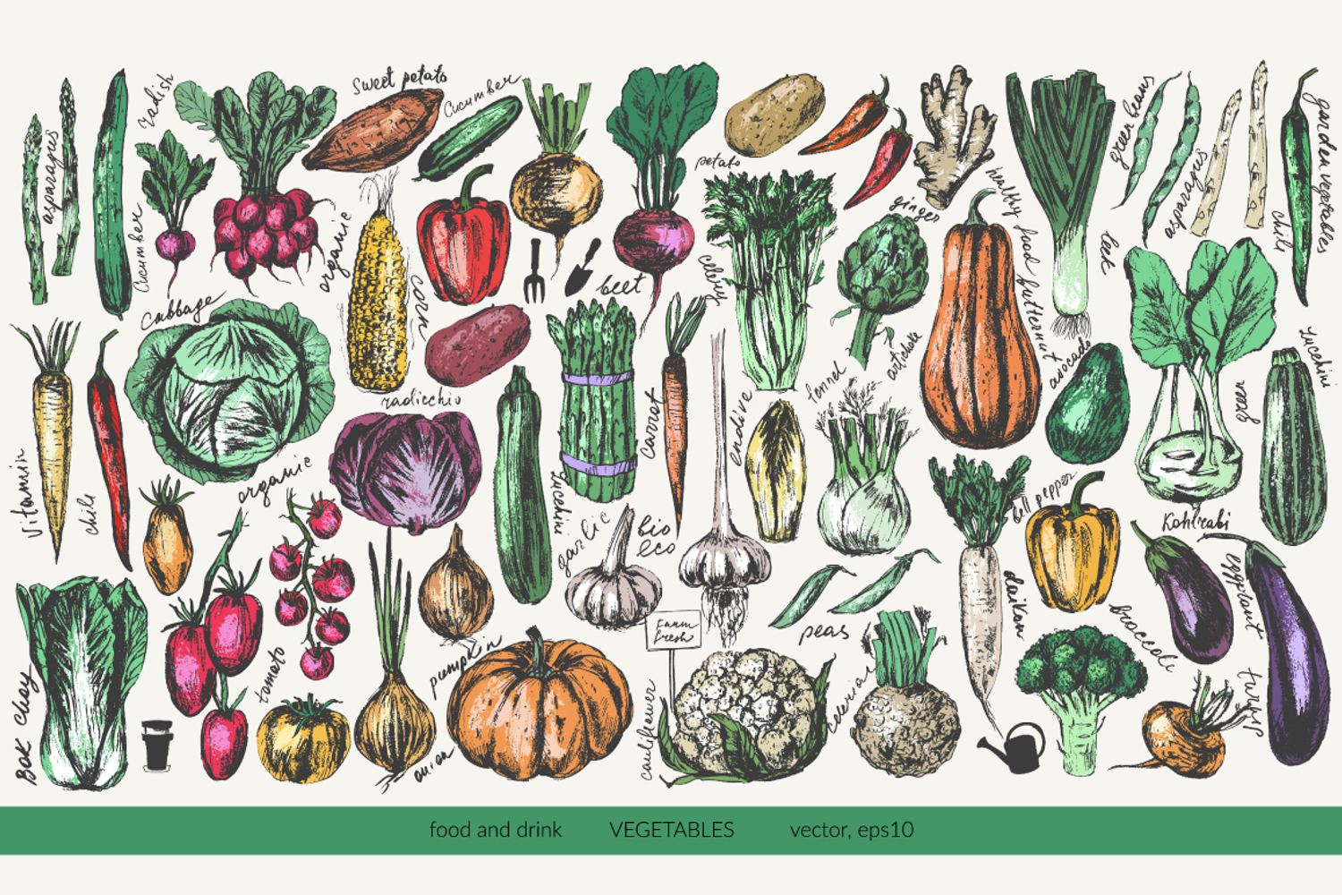 Hand drawn ink vegetable sketches set in 3 variants. Colored ink sketches with textures, ink sketches with white layer set, ink sketches set. Full list of garden vegetables and some varieties, hand written names. Tomato, cucumber, bell pepper, zucchini, pumpkin, butternut squash, corn, onion, radish, potato, green beans, asparagus, artichoke, cabbage, kohlrabi, avocado, carrot, eggplant, broccoli, cauliflower, sweet peas, celeriac, celery, chili, leek, bok choy, radicchio, garlic, daikon, turnip, beet, endive, fennel, sweet potato, ginger. For food and drink projects, organic farm background, vegetarian menu, labels, recipe cards.