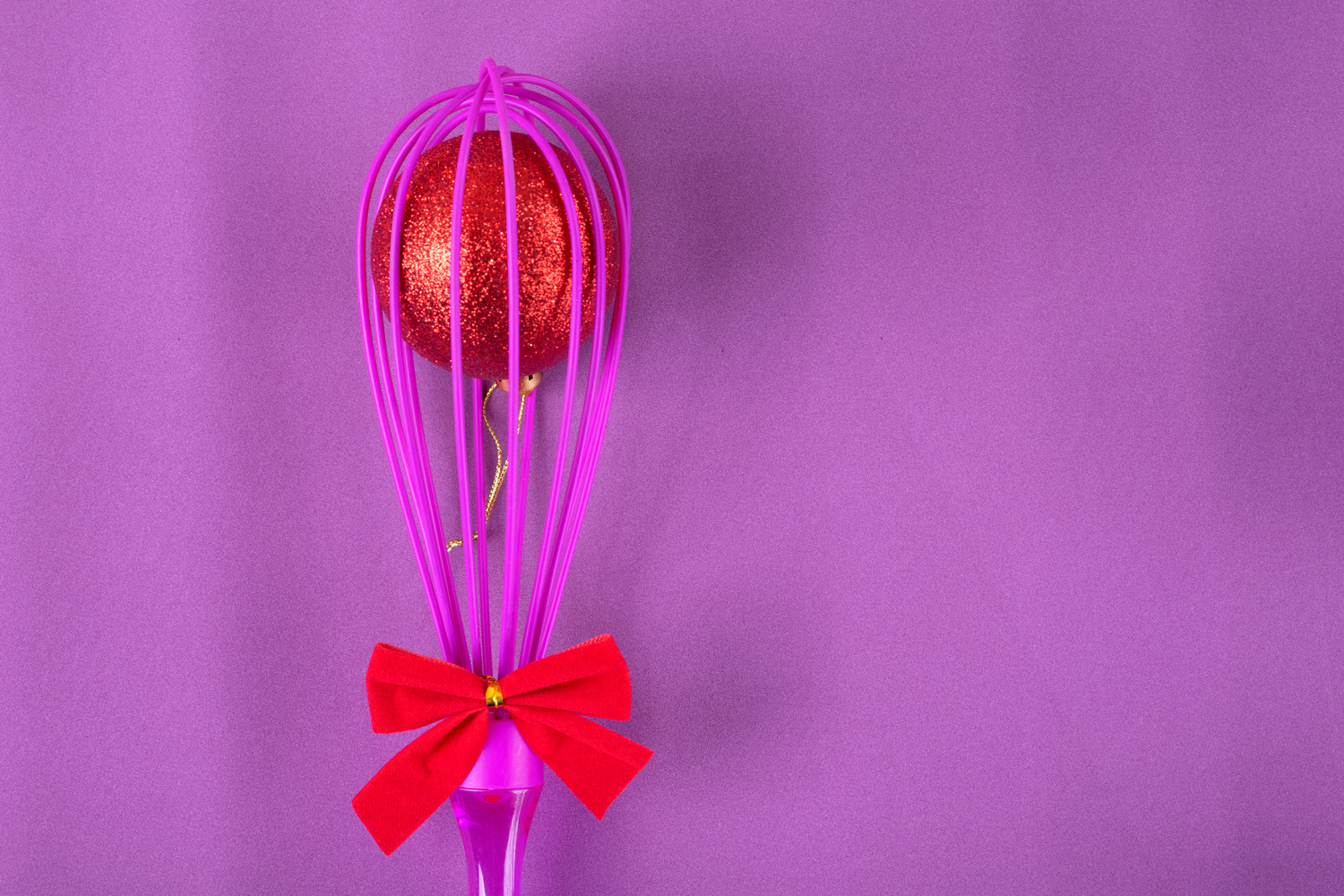 Pink pastry whisk with red Christmas bow and inside there is a sparkling red Christmas ball on a lilac background. Concept making holiday desserts to order. Copy space