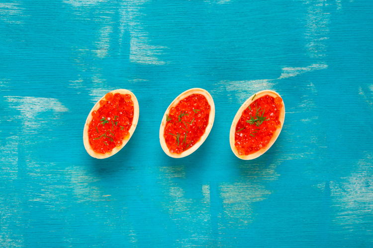 Red caviar tartlet appetizer on turquoise background. Top view. Copy space