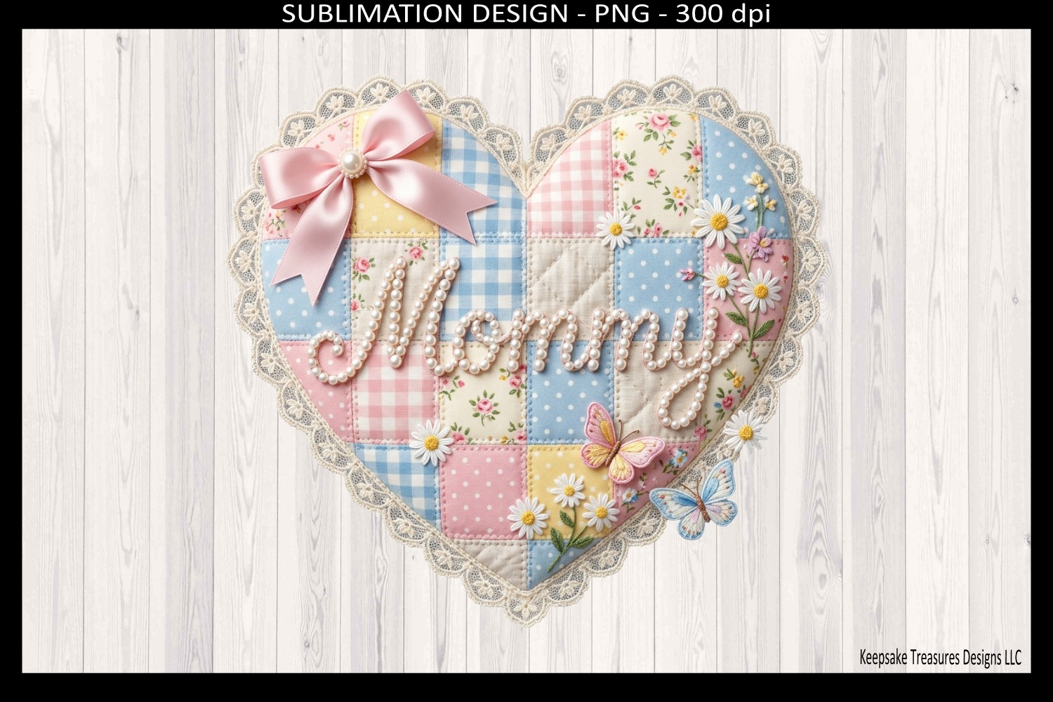 Celebrate the love of Mom with this sweet patchwork heart “Mommy” design, perfect for heartfelt DIY gifts and Mother’s Day creations. Featuring soft pastel quilt patterns, delicate florals, butterflies, lace trim, and a pink bow, this charming design brings a cozy handmade feel to your sublimation projects.