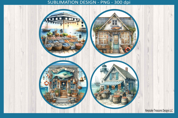This includes 4 round nautical-themed illustrations featuring seaside fish markets, charming coastal shops, and rustic fishing scenes—perfect for creating unique coasters, gifts, and home decor pieces. Whether you're crafting a heartfelt Father’s Day gift, a birthday surprise, or decorating a beach house, these designs add the perfect touch of seaside nostalgia 🌊