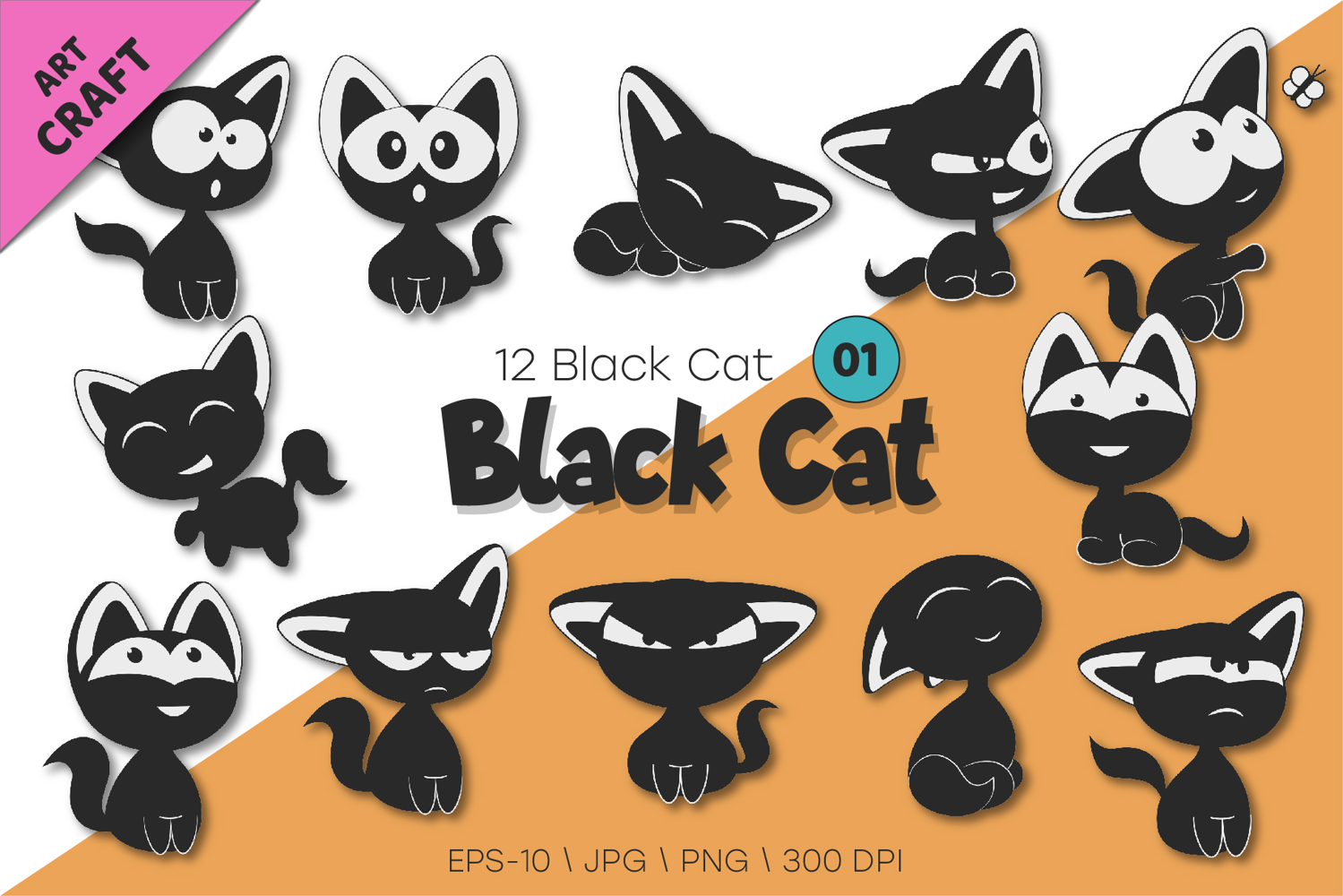 Set of 12 black cats, made in Minimalistic style of flat silhouette, in black and white colors. Characters look mischievous and playful. Simple, bold shapes, clean vector design, black and white color scheme.