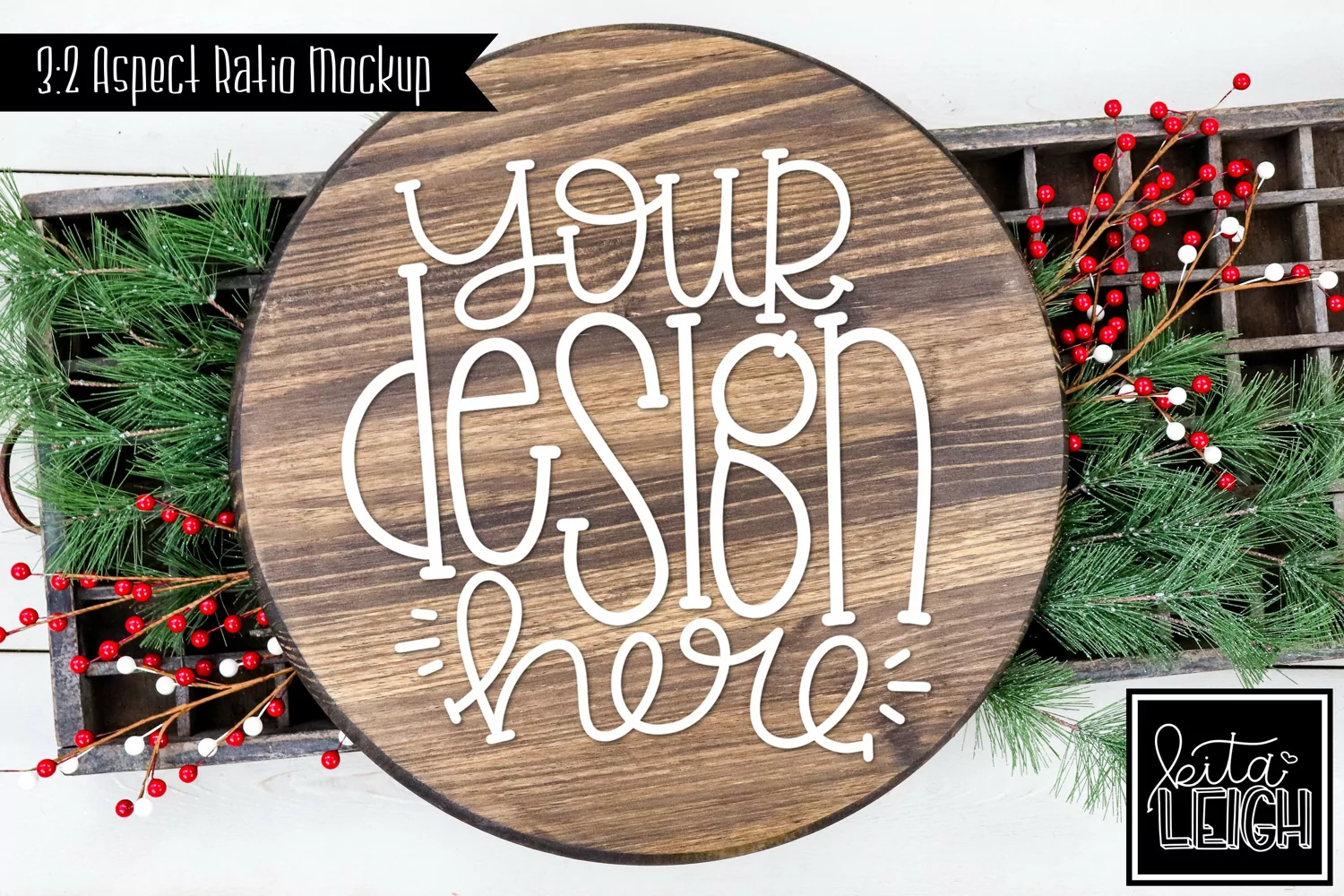 Wood Round Christmas Mockup with Holly Accents Photo