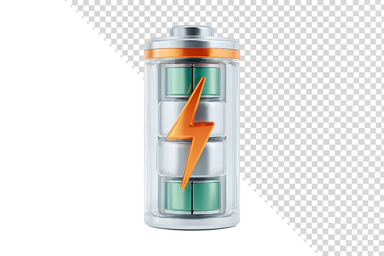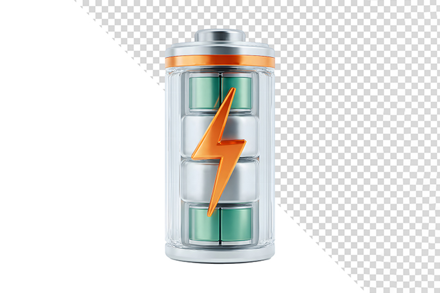 High-tech 3D battery illustration featuring transparent glass casing that reveals internal cylindrical energy cells. Modern power storage unit with lightning icon isolated on background. Ideal for technology and engineering designs.