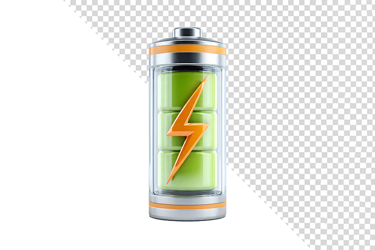 3D Glossy Green Battery Icon with Orange Lightning Bolt