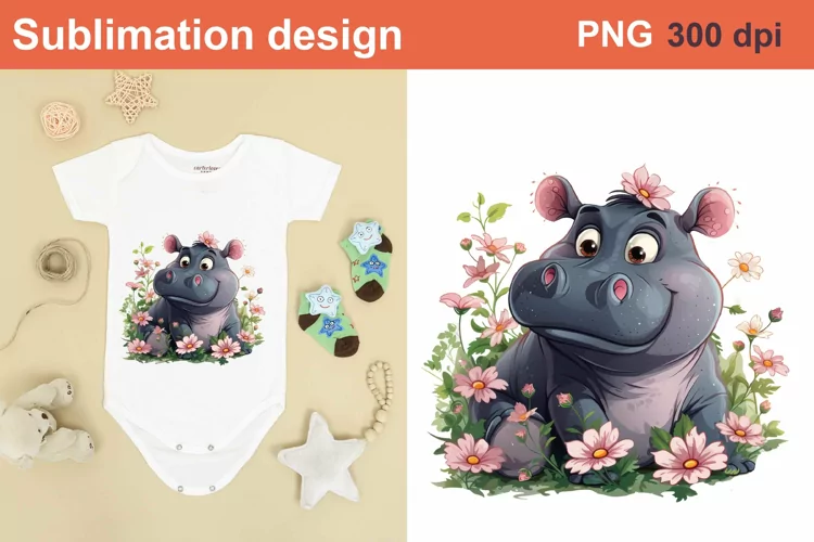 Spring Hippo sublimation | Hippo in flowers clipart example image 1
