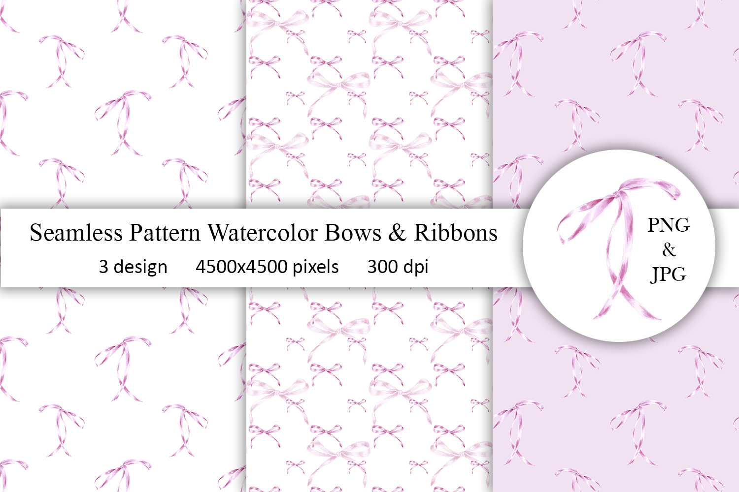 Watercolor digital paper, watercolor seamless paper set, bows seamless pattern
