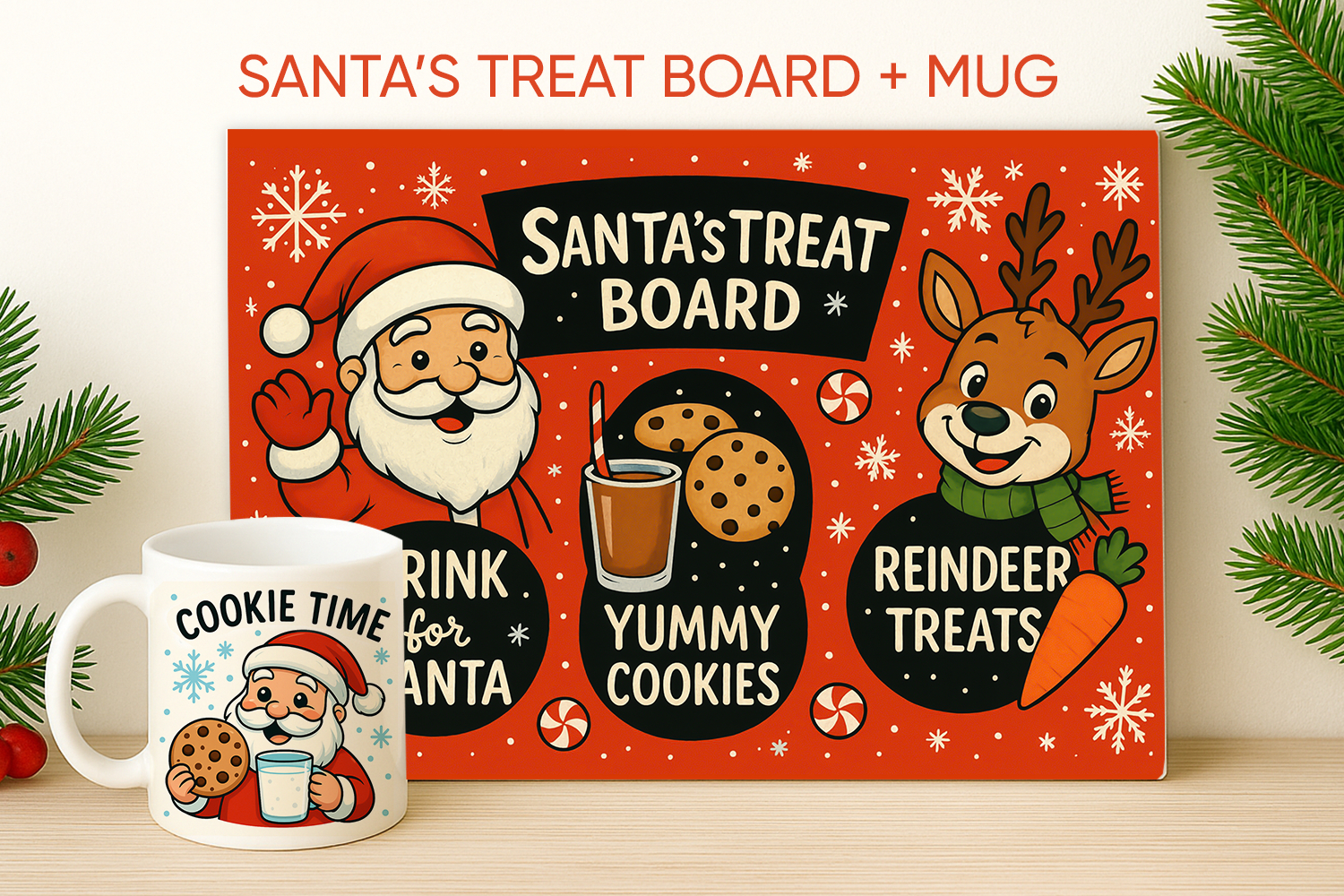 Christmas cutting board (11.6 × 8.2 in) and mug (11 oz) set for Santa’s milk and cookies. Cute festive sublimation design – the perfect holiday gift for kids and families. Make your Christmas Eve extra special!