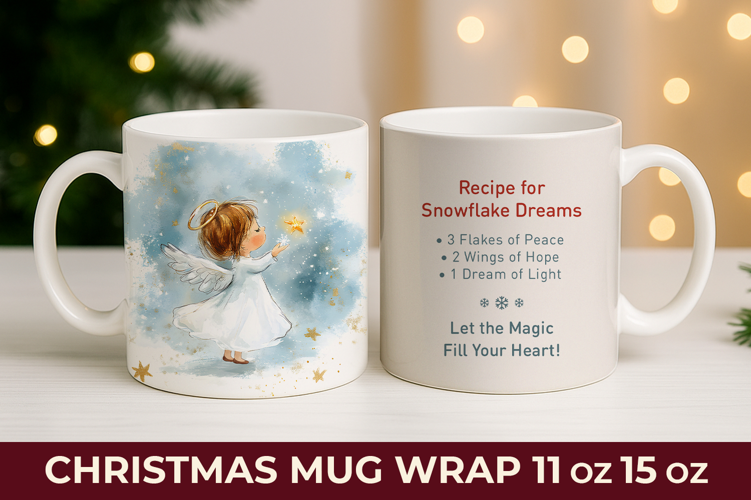 Perfect for 11 oz & 15 oz sublimation mugs, featuring a sweet angel and festive recipe.