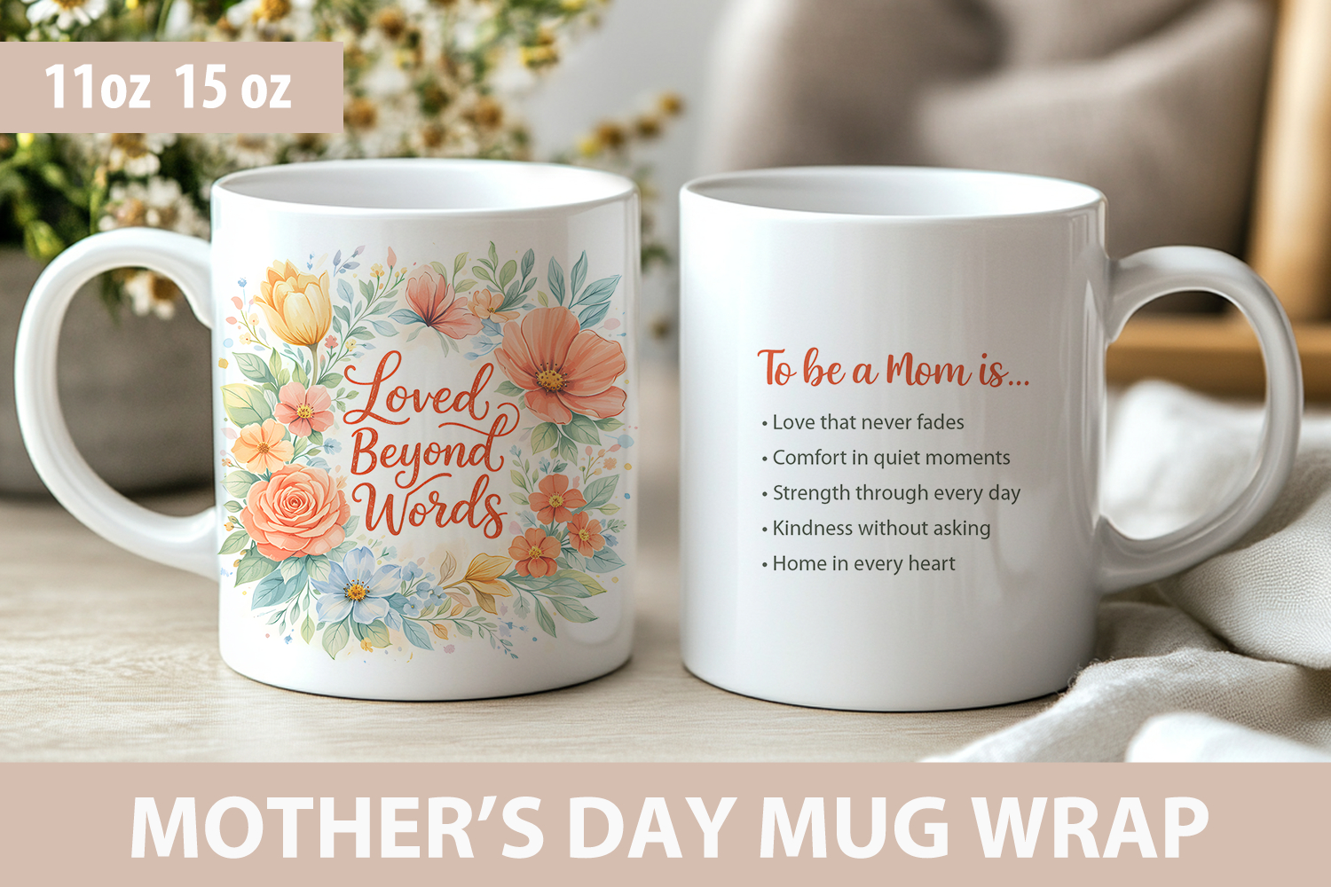 This Mother’s Day mug wrap sublimation design is perfect for creating custom coffee mugs for moms. The design is optimized for sublimation printing and fits 11 oz and 15 oz mugs, making it ideal for gift.