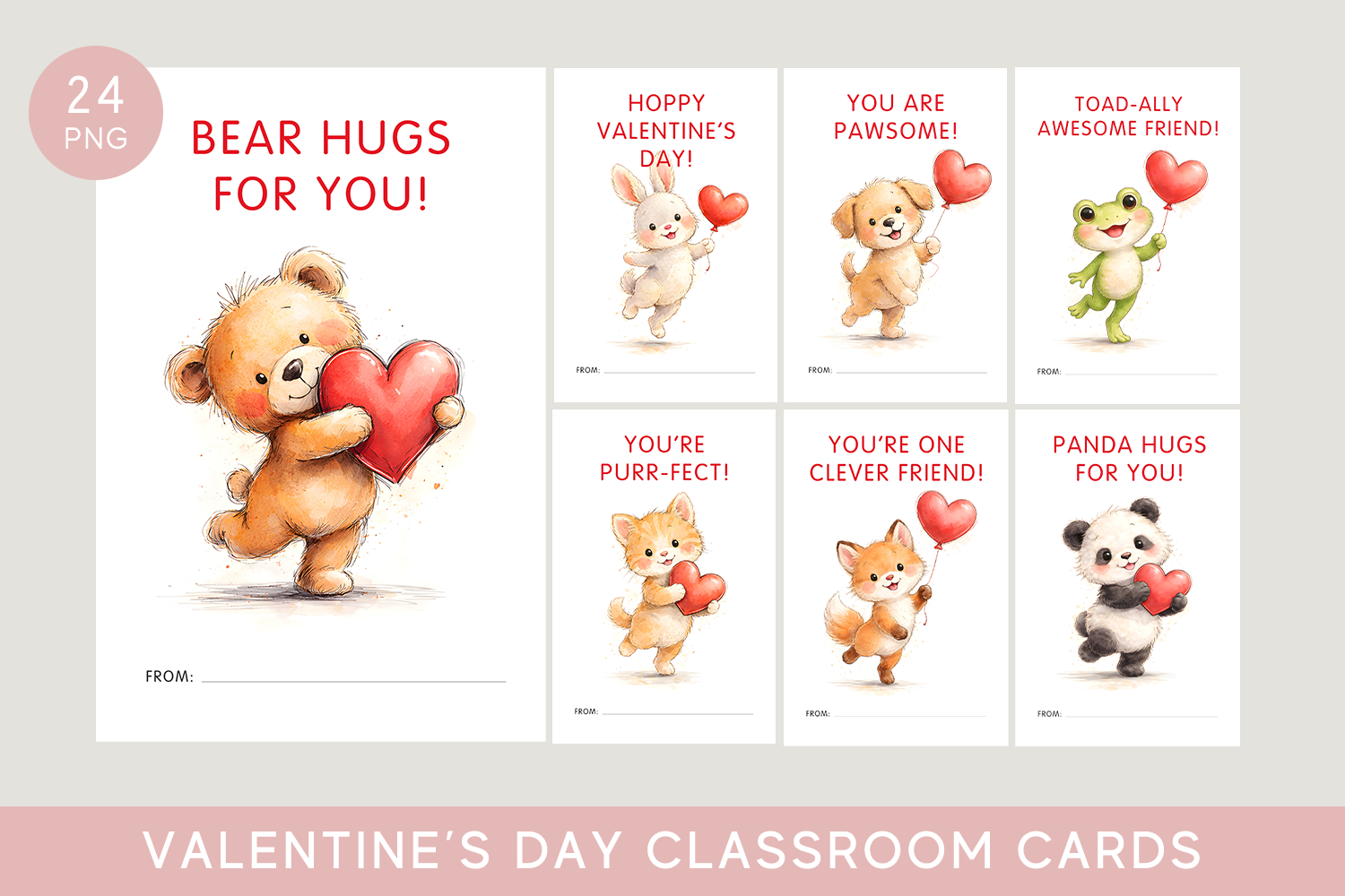 This printable Valentine’s Day classroom card set contains 24 separate PNG card files, giving you full control over how you print and arrange your cards.