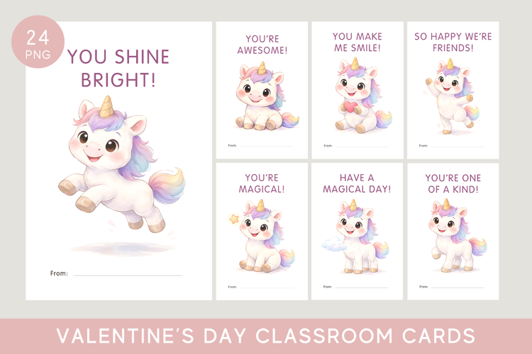 Each card features a cute unicorn illustration with a short, classroom-safe Valentine message. The designs are perfect for school Valentine, kids’ parties, and classroom celebrations.