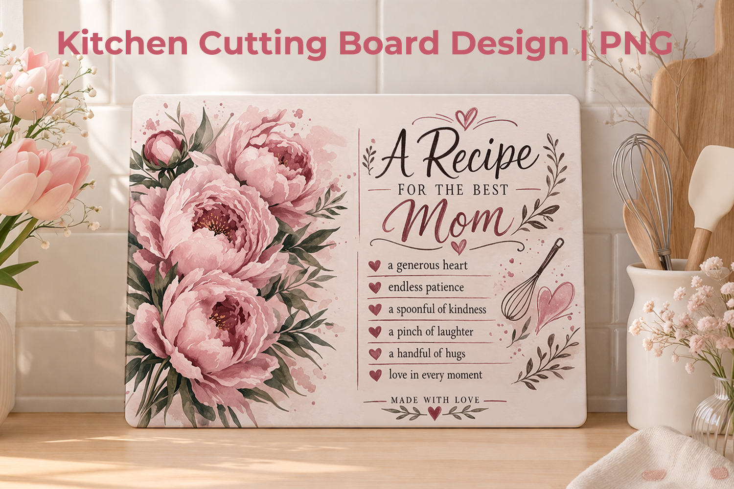 This 8x11 inch PNG design is made for a charming Mother’s Day cutting board gift. The illustration includes a baking-inspired kitchen scene with flowers, cupcakes, and soft pink details that feel warm and giftable. It is ideal for sublimation on glass cutting boards and other kitchen decoration products. The horizontal layout makes it easy to use for an 8x11 inch board design.