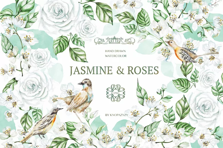 This watercolor set consists of 42 watercolor elements. They include patterns, bouquets, wreaths and elements separately. Delicate watercolor roses and jasmine flowers, leaves and buds.