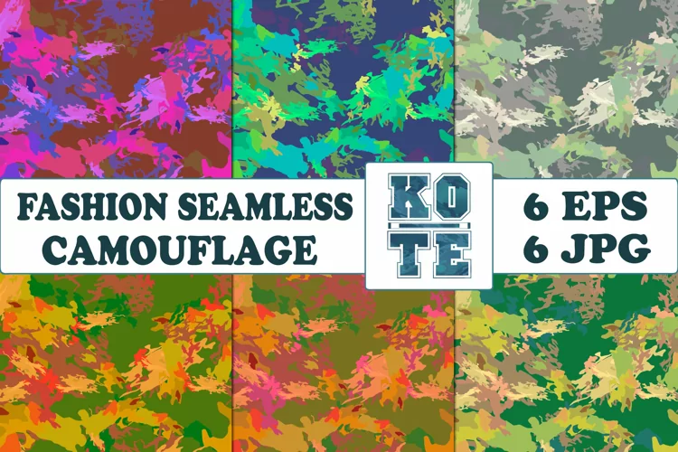 This pack will be available as 1 zip file which contains 6 EPS and 6 JPG images with seamless patterns - Fashion Camouflage in blue, green, yellow, brown, grey, beige, orange, pink, red and violet colors. You can tile them to get whatever size you like, these patterns also can be used for fabrics, large prints or backgrounds.