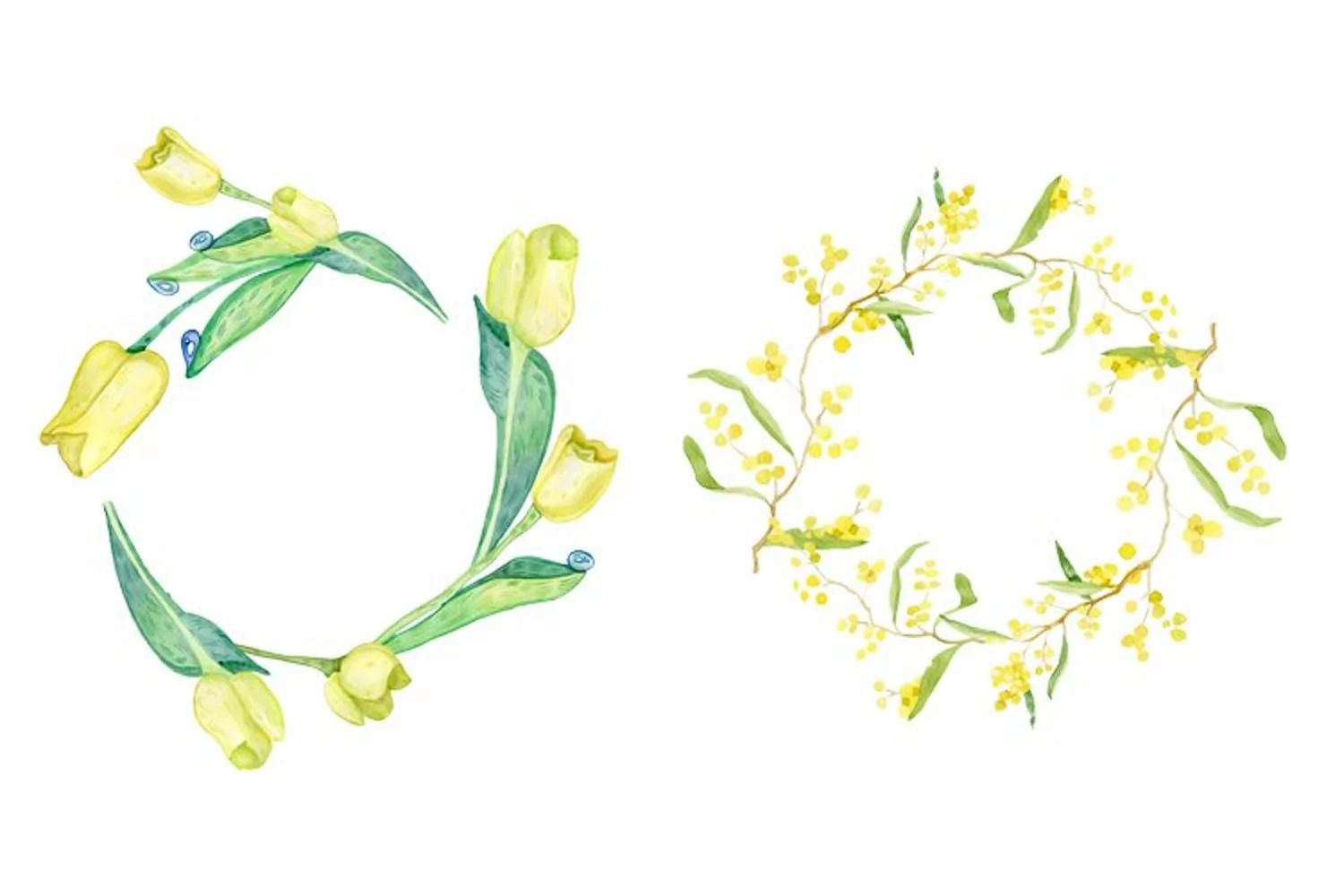 Watercolor illustration.Tulips wreath and Mimosa wreath. Round frame. Isolated illustration on transparent background.