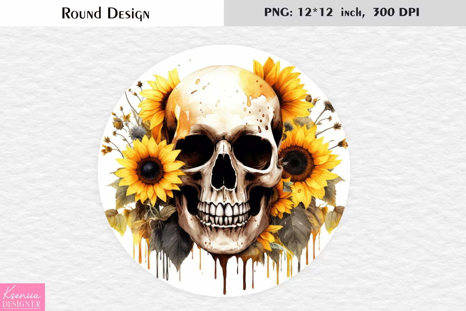 Watercolor Sunflower Skull|Flower Halloween Round Design example image 1