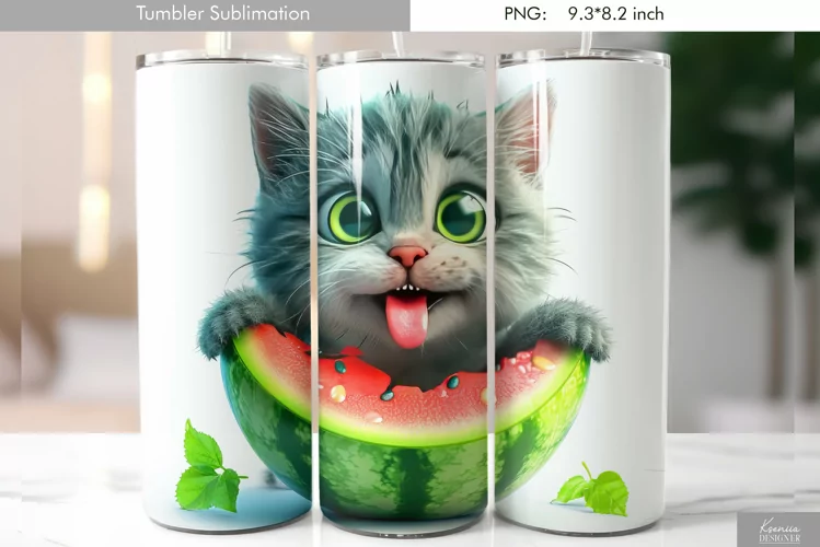 Gray Cat with Watermelon|Animal Tumbler Sublimation