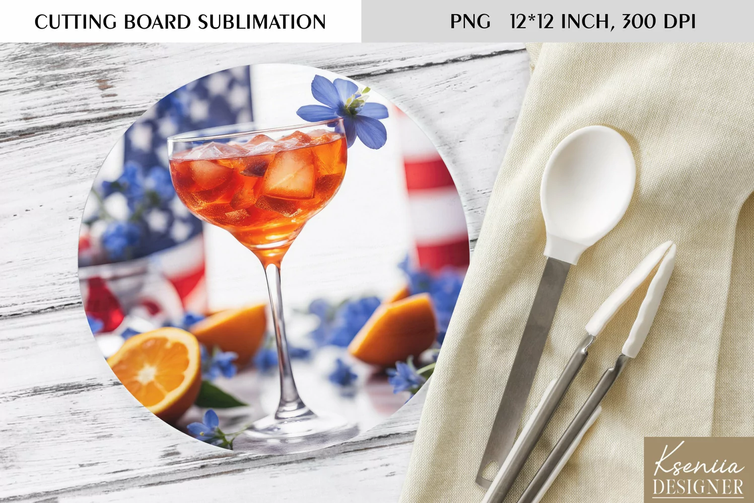 Patriotic Floral Cocktail|Round Cutting Board Sublimation example image 1
