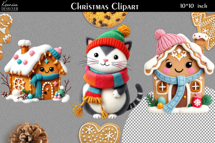 Kawaii Christmas Design Cozy Winter Knitted Art Felted Holiday Illustration Soft Pastel Christmas Aesthetic Trendy 2026 Holiday Clipart Cute Winter Character Art Cozy Scarf And Beanie Style Festive Warm Texture Design Adorable Holiday Season Graphics Cute Christmas Clipart Cat Gingerbread
