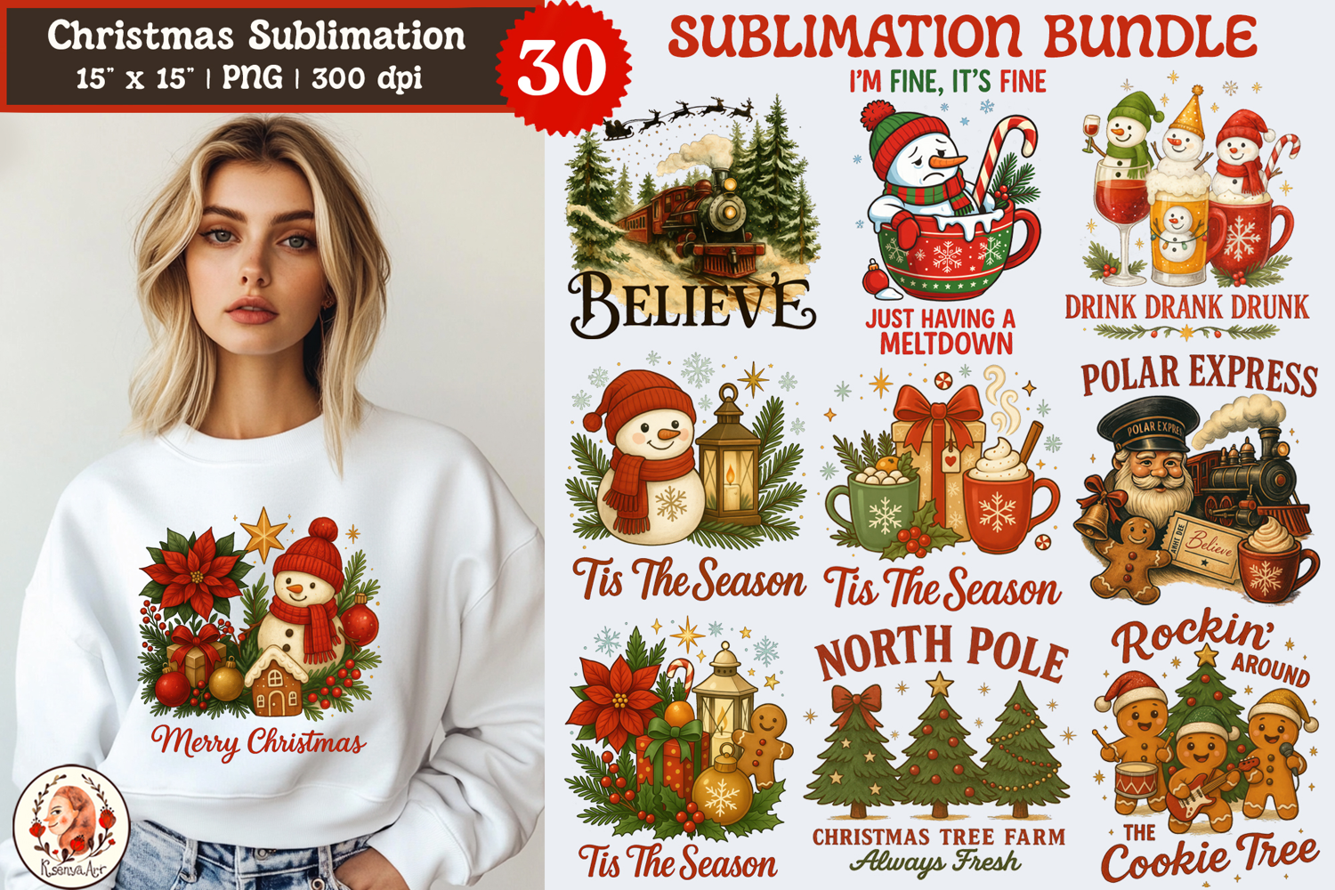 This collection includes 30 high-quality PNG designs (300 DPI, 15”x15”), perfect for sublimation on sweatshirts, t-shirts, mugs, pillows, tote bags, and festive holiday décor.