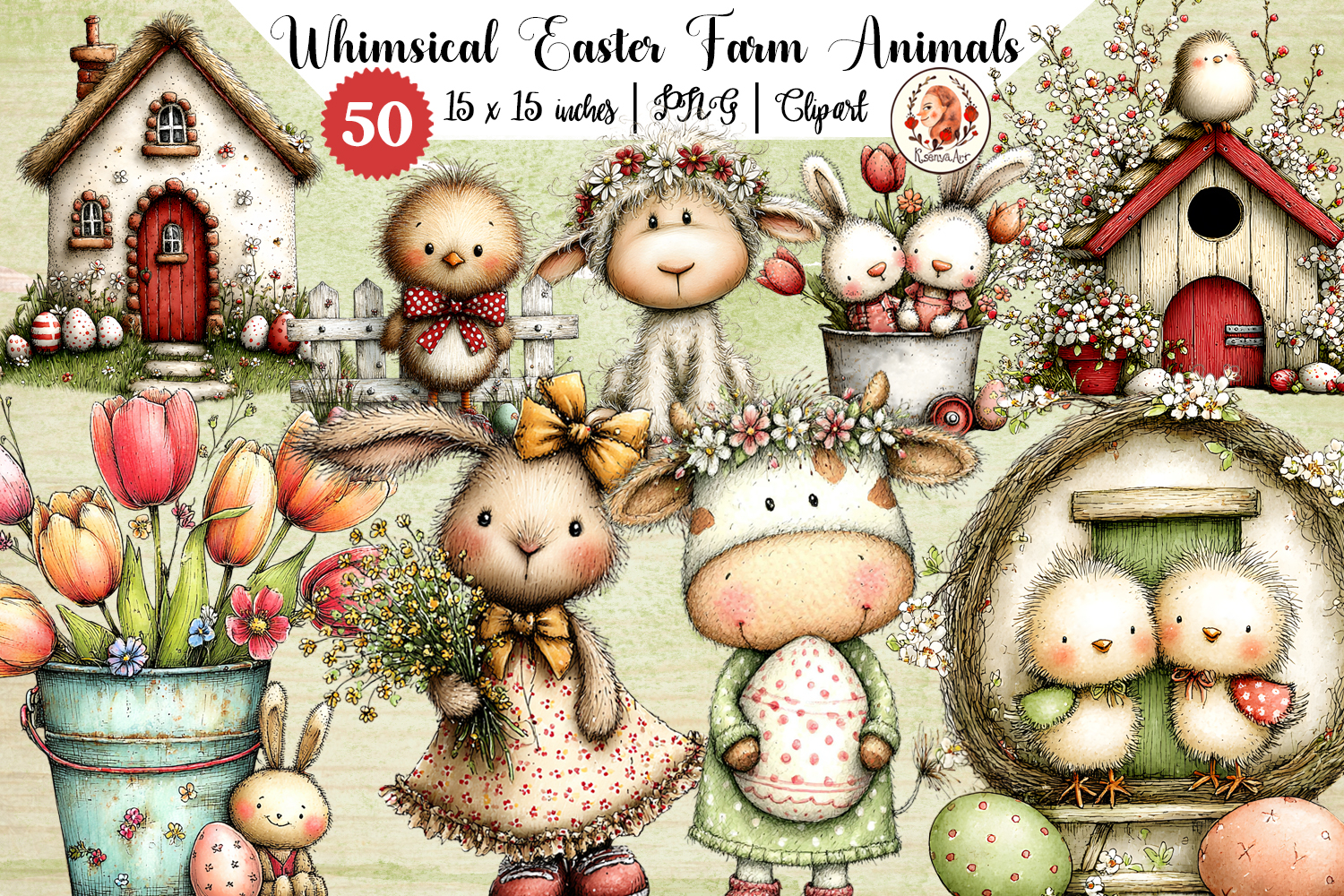 Easter Whimsical Bunny and Farm Animals Clipart Bundle
