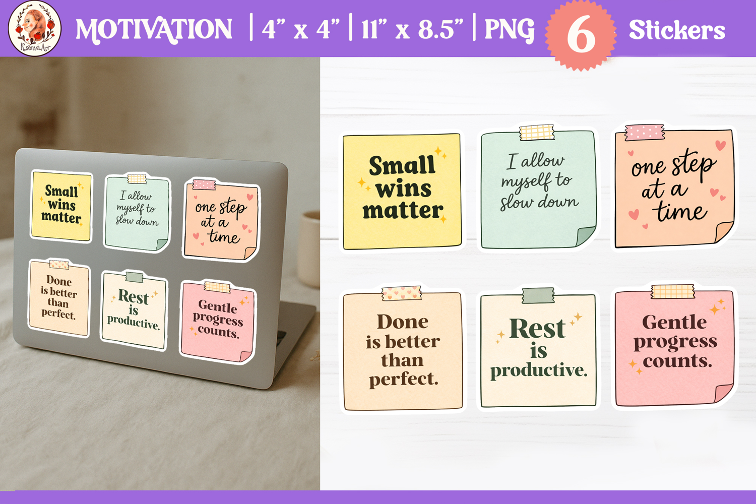 This uplifting Motivation Stickers includes 6 cozy affirmation designs styled as cute pastel sticky notes with soft colors, gentle typography, and comforting messages. Each sticker features a positive reminder like “Small wins matter,” “Done is better than perfect,” and “Gentle progress counts,” designed to support mindfulness, productivity, and self-care.