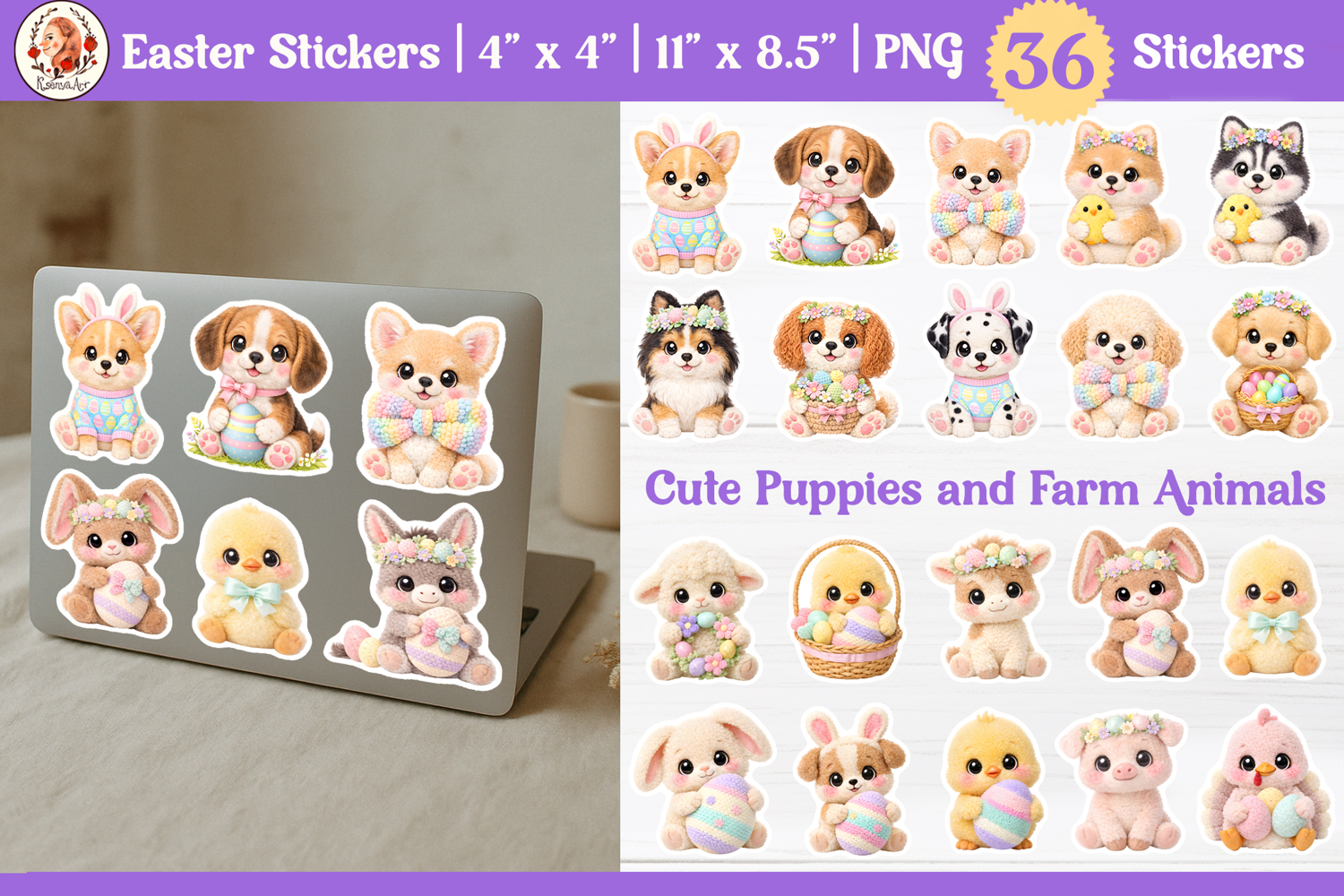Celebrate Easter with this adorable Cute Easter Stickers Bundle featuring 36 sweet puppies and farm animals in a soft, cozy spring style.