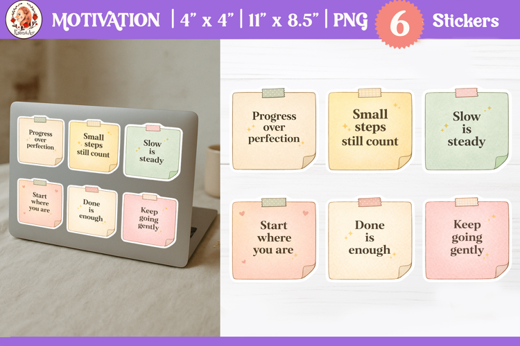 This uplifting Motivation Stickers includes 6 cozy affirmation designs styled as cute pastel sticky notes with soft colors, gentle typography, and comforting messages. .