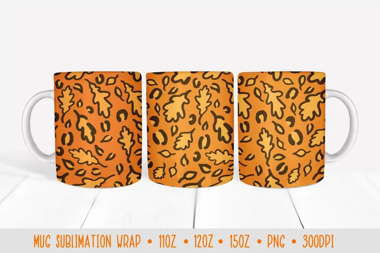 Autumn leaves Mug Sublimation Design. Fall leopard mug wrap