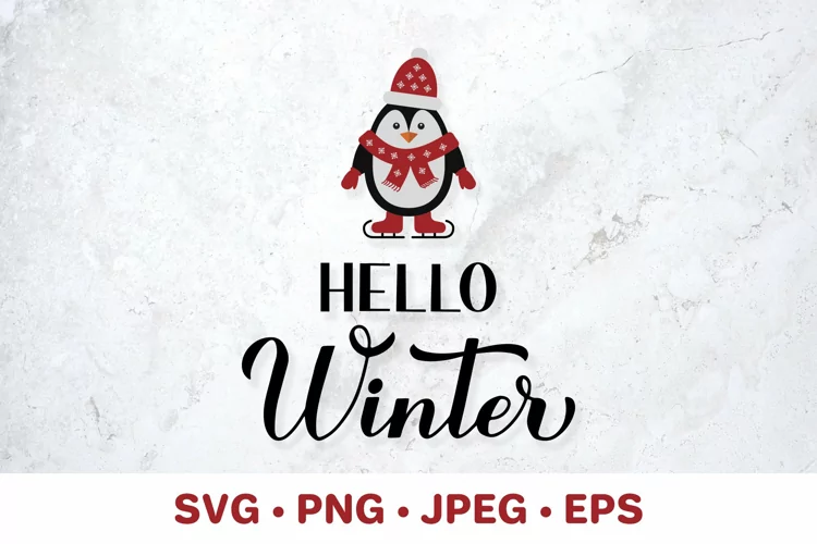 Hello Winter SVG. Winter quote. Cute penguin on skates