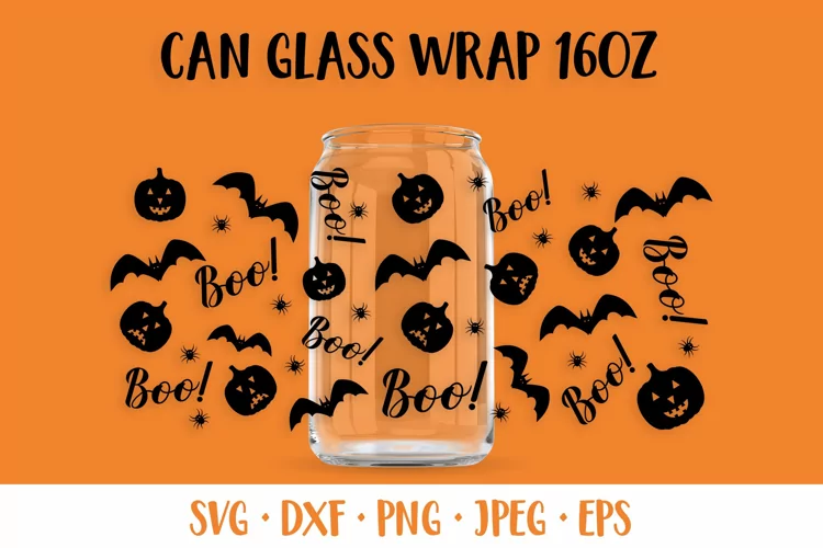 Halloween Pumpkin and Bats Can Glass Wrap SVG. Boo Glass Can