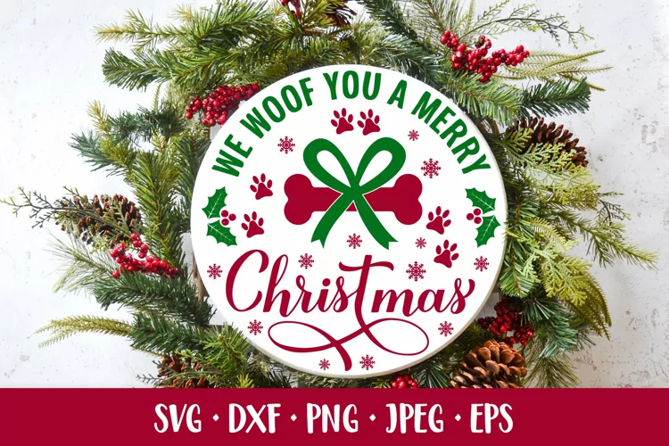 We woof you a Merry Christmas round sign SVG. Dog quote