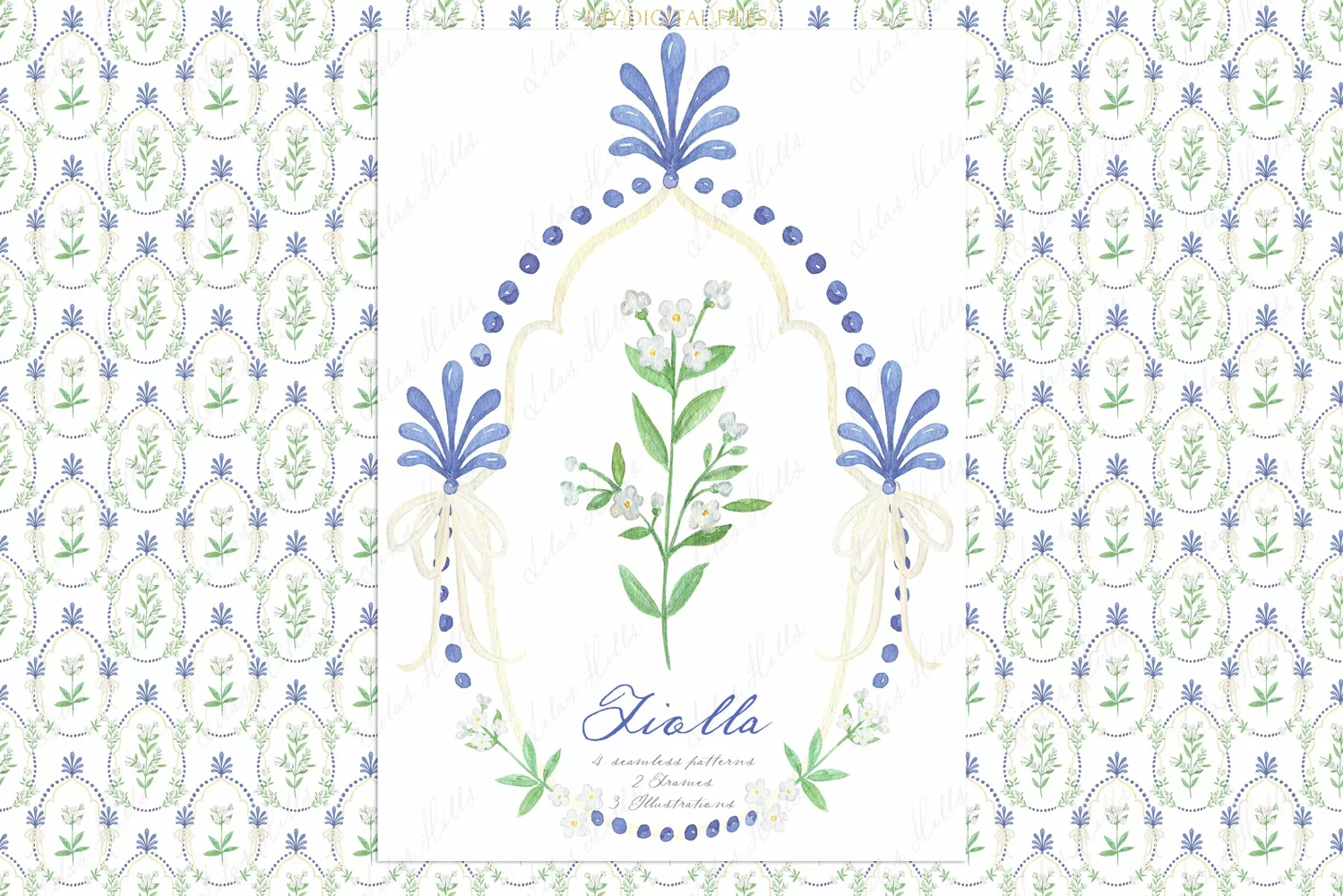 Retro Frame Botanical Blue Wedding Clipart White Seamless Pattern Watercolor Clipart Vintage Clipart Grandmillennial
