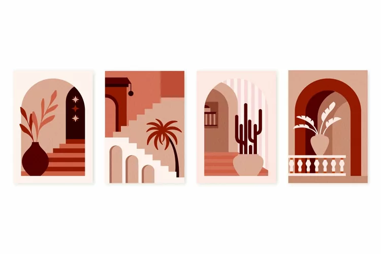 Bohemian style print. Contemporary art, wall aesthetic posters with arch and moroccan stairs. Ancient vases, bohemian architecture swanky vector banner. Illustration of bohemian contemporary geometric