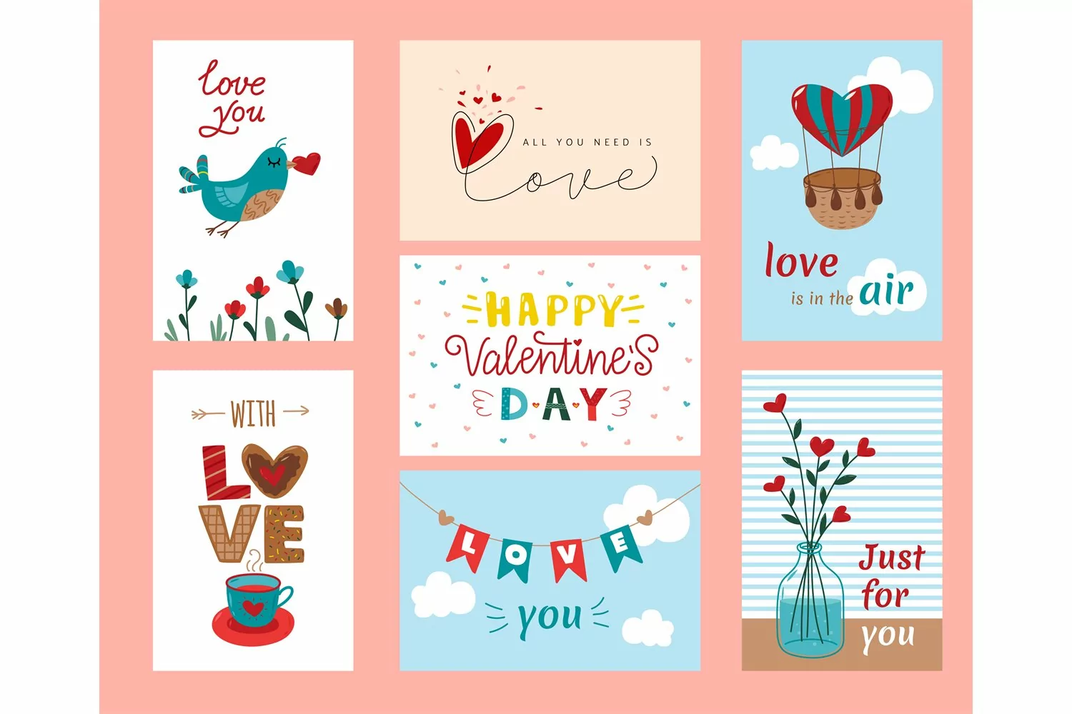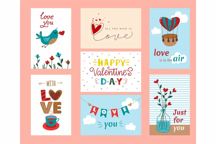 Romantic love postcard. Valentines day design cards, birthday party or banners with hearts. Cute happy posters with air balloon, bird and cup, classy vector set. Illustration of valentine heart cards