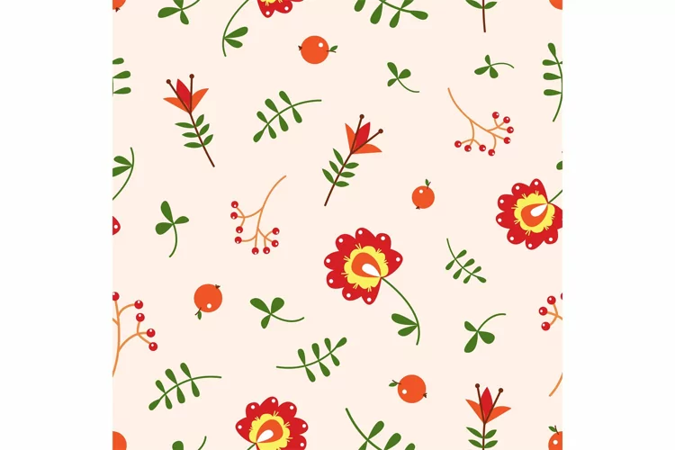 Floral contemporary decorative seamless pattern. Flowers and branches, autumn leaves and berry. Fall orange red nature elements, vector background. Illustration of floral seamless pattern design