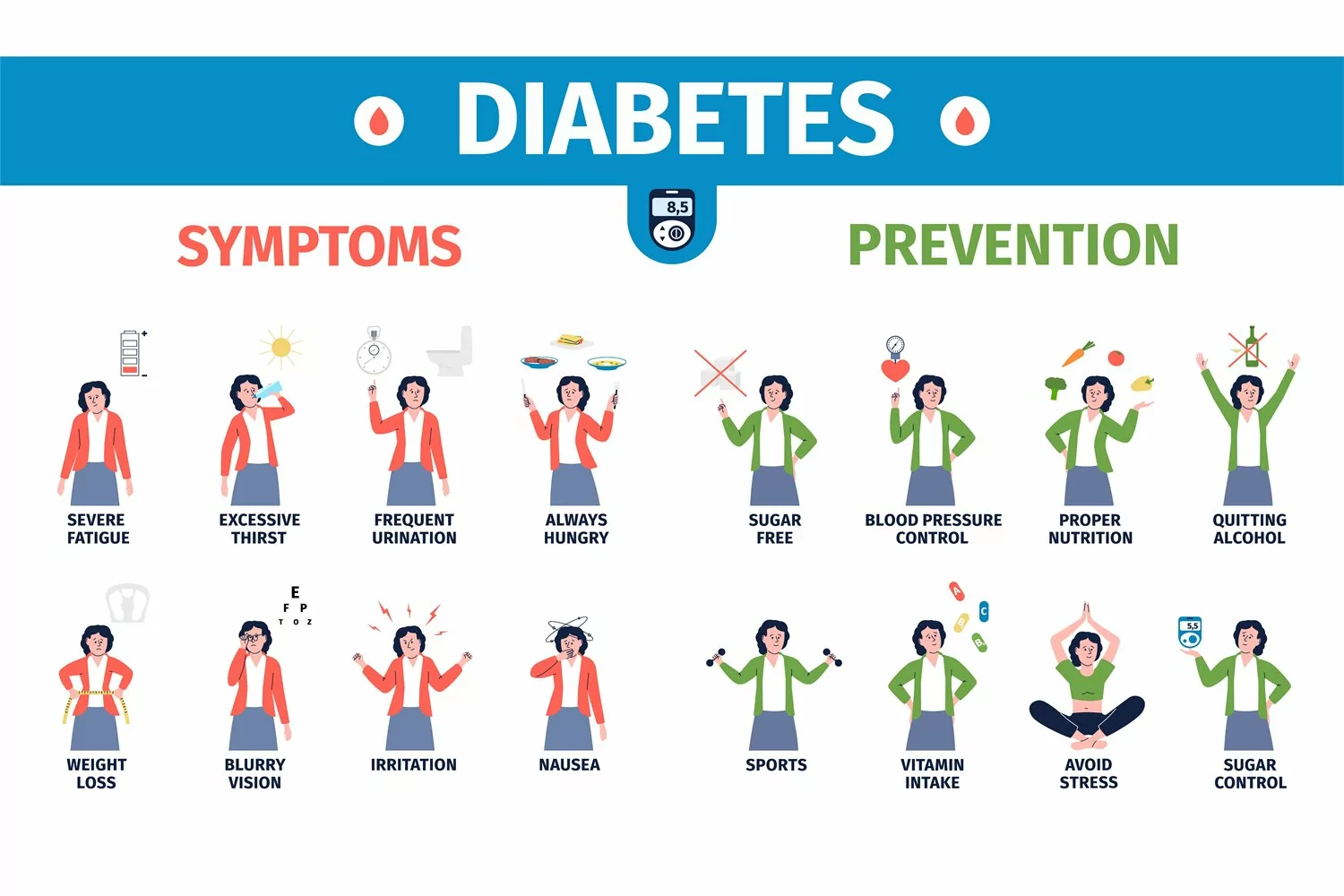 Diabetes poster education about symptoms and prevention. Gir