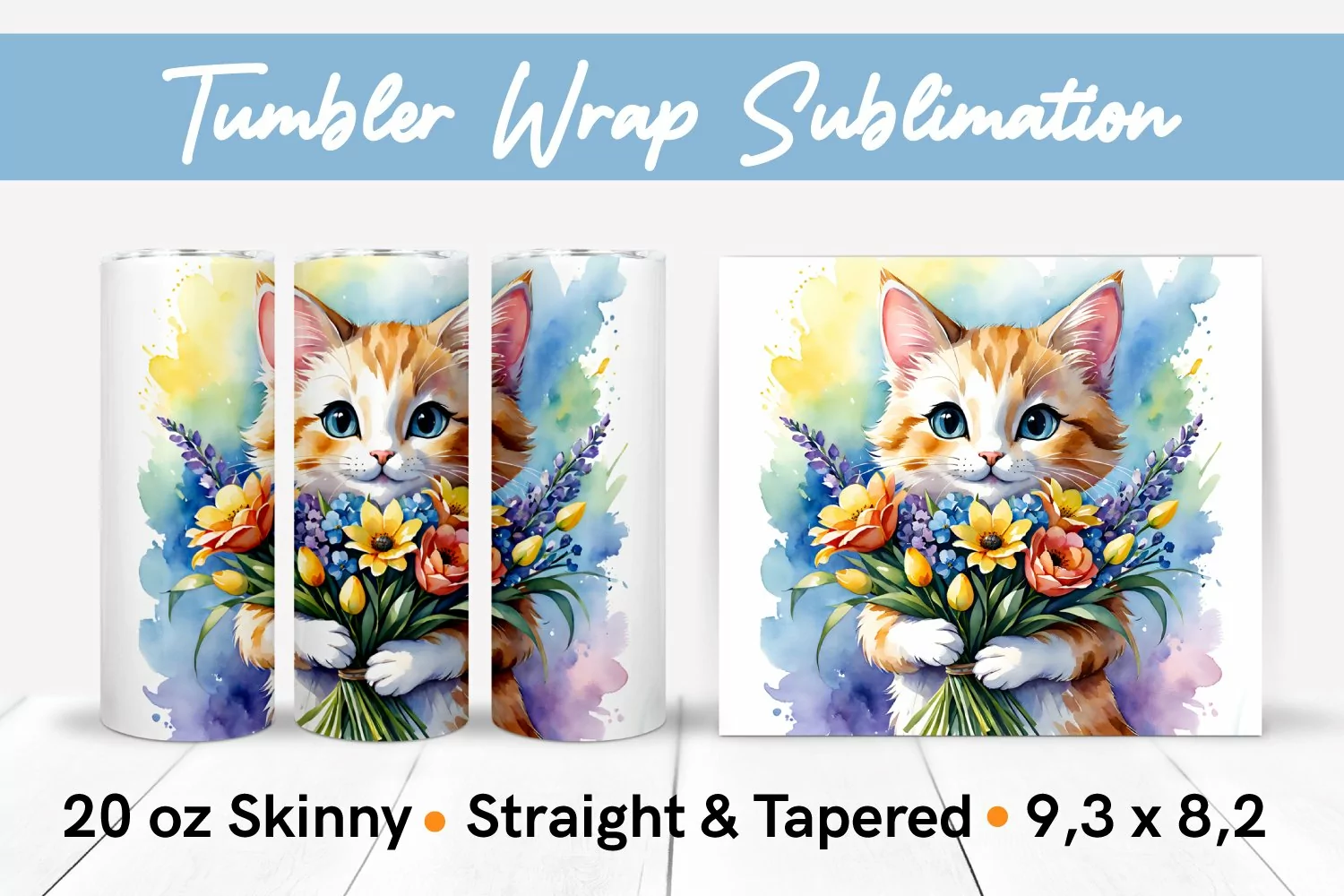 Cute Watercolor Cat with Spring Flowers - 20 Oz Skinny Tumbler Wrap Sublimation, Straight and Tapered designs.